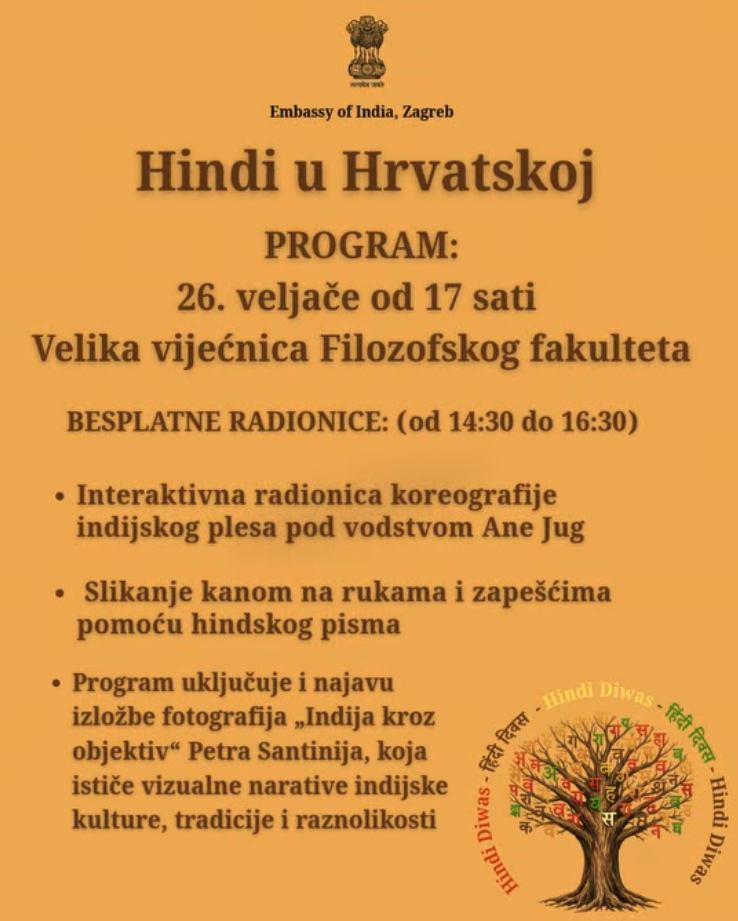U četvrtak, 26. veljače u Vijećnici Filozofskoga fakulteta Sveučilišta u Zagrebu održat će se u 17 sati proslava Dana hindskoga jezika. Proslavite s nama dan jednoga od najvećih svjetskih jezika, trećega na svijetu po ukupnome broju govornika. Spremamo prigodan program i zahusku indijskih specijaliteta pod pokroviteljstvom Veleposlanstva Republike Indije. Srdačno ste svi pozvani!